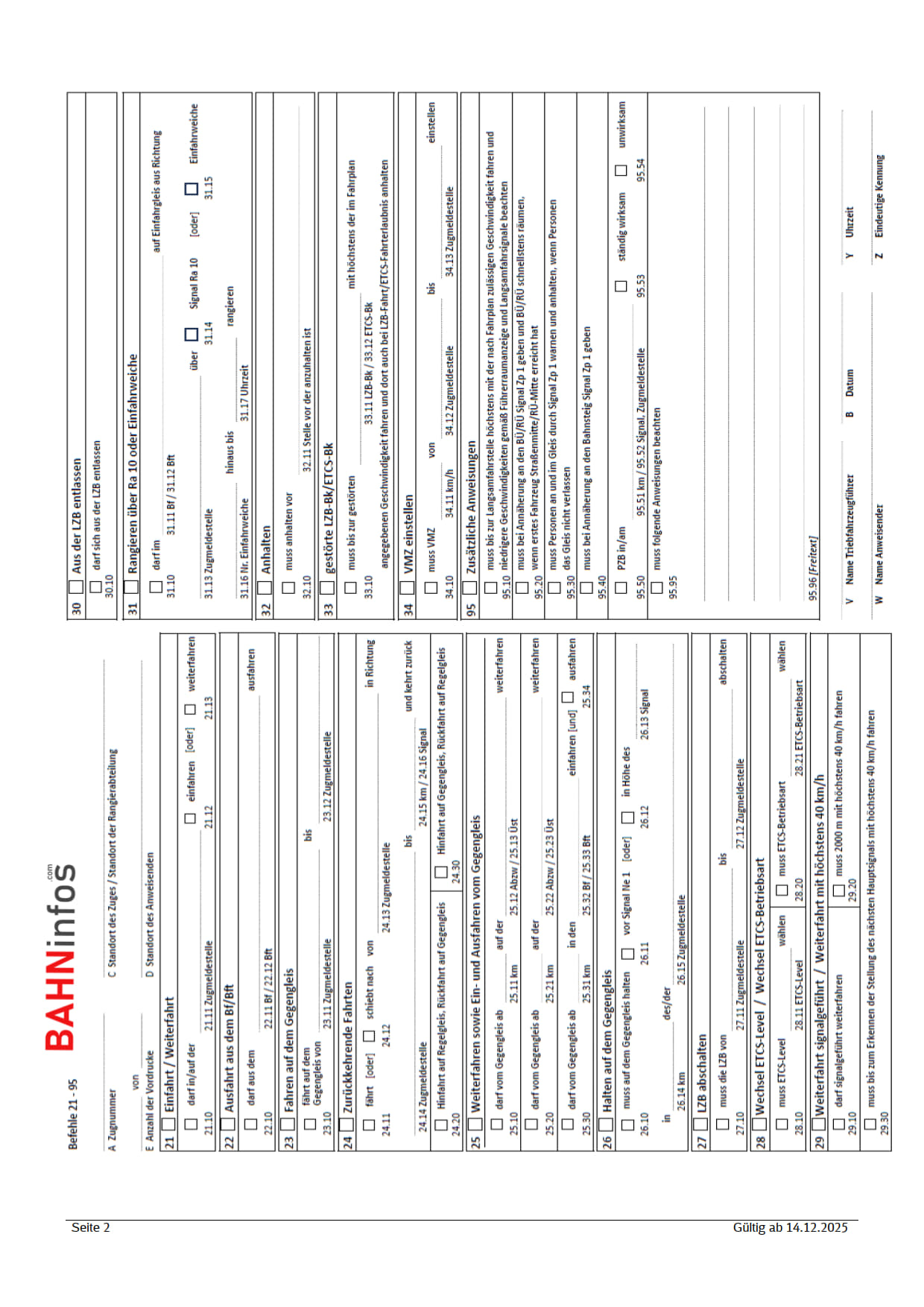 Zum Fahrplanwechsel im Dezember 2025 wird in Deutschland ein neuer, europäisch standardisierter Befehlsvordruck eingeführt, um die Vorgaben der TSI OPE (Technische Spezifikation für die Interoperabilität für den betrieblichen Teil des Eisenbahnsystems) umzusetzen. Dieser neue Vordruck ist ein Teil des Projekts zur Digitalisierung des Befehls, das die traditionellen schriftlichen Befehle ablösen soll. Er vereinfacht die Kommunikation über Ländergrenzen hinweg, indem die Befehle 1 bis 9 auf der Vorderseite standardisiert sind, auch wenn die deutsche Rückseite weiterhin spezifische nationale Regelungen enthält.