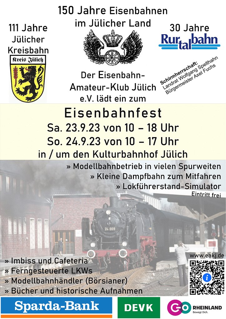 Großes Eisenbahnfest zum Streckenjubiläum im (Kultur-) Bahnhof Jülich: Modellbahnbetrieb in vielen Spurweiten auf einem halben Dutzend Anlagen – 5-Zoll-Dampfbahn zum Mitfahren – Lokführerstands-Simulator – Ferngesteuerte Lkw’s – Mehrere Modellbahnhändler (“Börsianer”) – Präsentation historischer Fotos & Filme der Eisenbahnen rund um Jülich – Souvenir- und Bücherverkauf – Infostand der Rurtalbahn/RATH-Gruppe – Für Essen und Trinken ist gesorgt (Pommesbude, Kiosk, Kaffee, Kuchen u.a.) – Betriebszeiten: Sa 10-18 Uhr, So 10-17 Uhr – Zur Anreise empfehlen wir die Rurtalbahn von Düren bis Jülich Bahnhof (Sa+So stündlich)