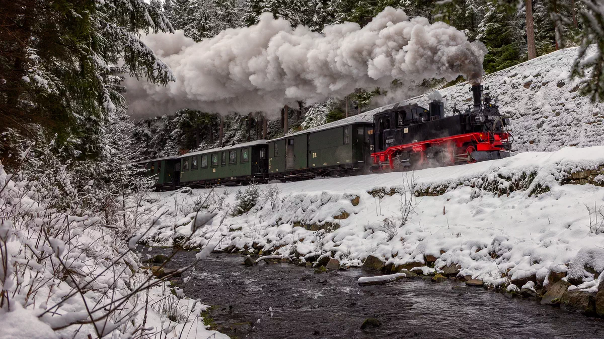 Nach einem Winterspaziergang warten unsere gut geheizten Wagen am Bahnsteig – warme Getränke sind auch im Buffetwagen dabei!